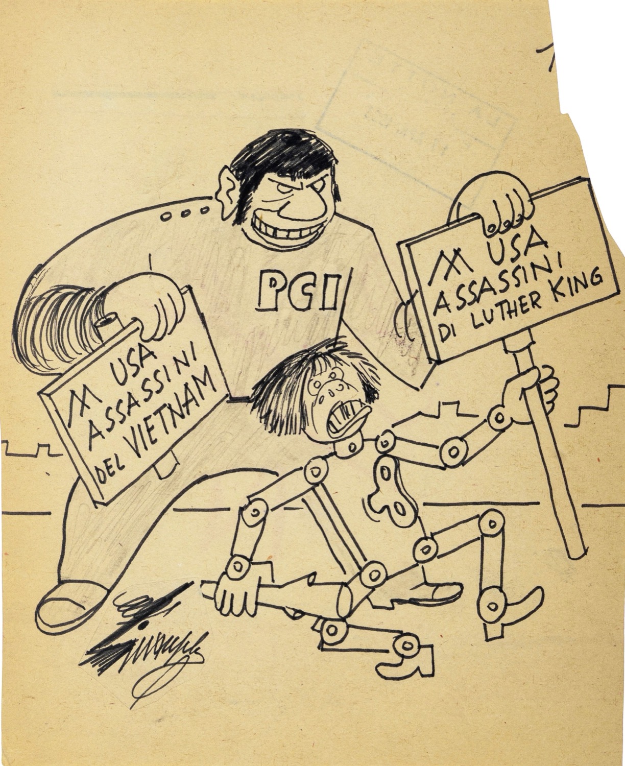 Illustrazione originale realizzata da Guareschi e pubblicata sulle pagine del quotidiano La Notte il 11 aprile 1968. "Adesso gira un po' con questo " Lievi pieghe. Firmata al fronte e datata al retro.