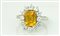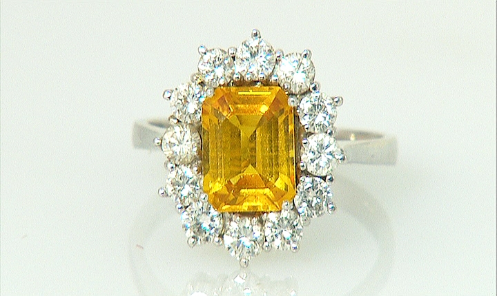 ANELLO. In oro bianco 18 kt sommità a fiore con al centro gemma gialla taglio smeraldo (prob. zaffiro) entro cornice in diamanti taglio brillante per tot. cts. 1,30 ca.