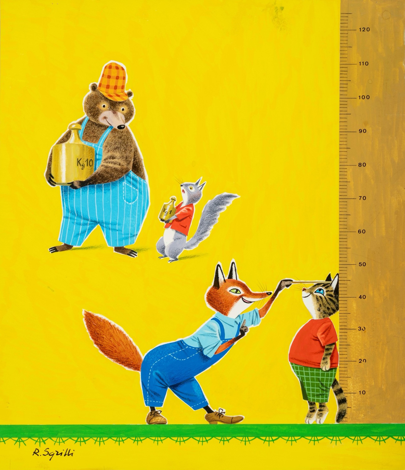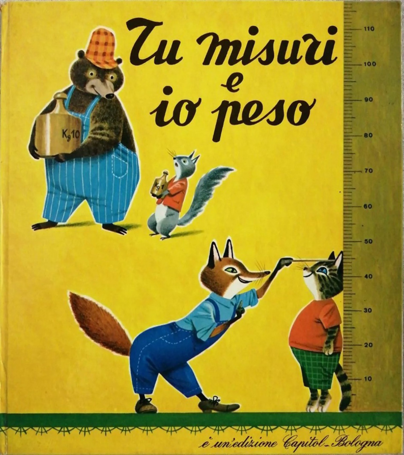 Coppia di 2 originali di copertina realizzati da Sgrilli per i libri "Tu misuri e io peso" e "L'ora cos'è? Il litro quant'è?", editi dalla Editrice Capitol nel 1970. Firmati.