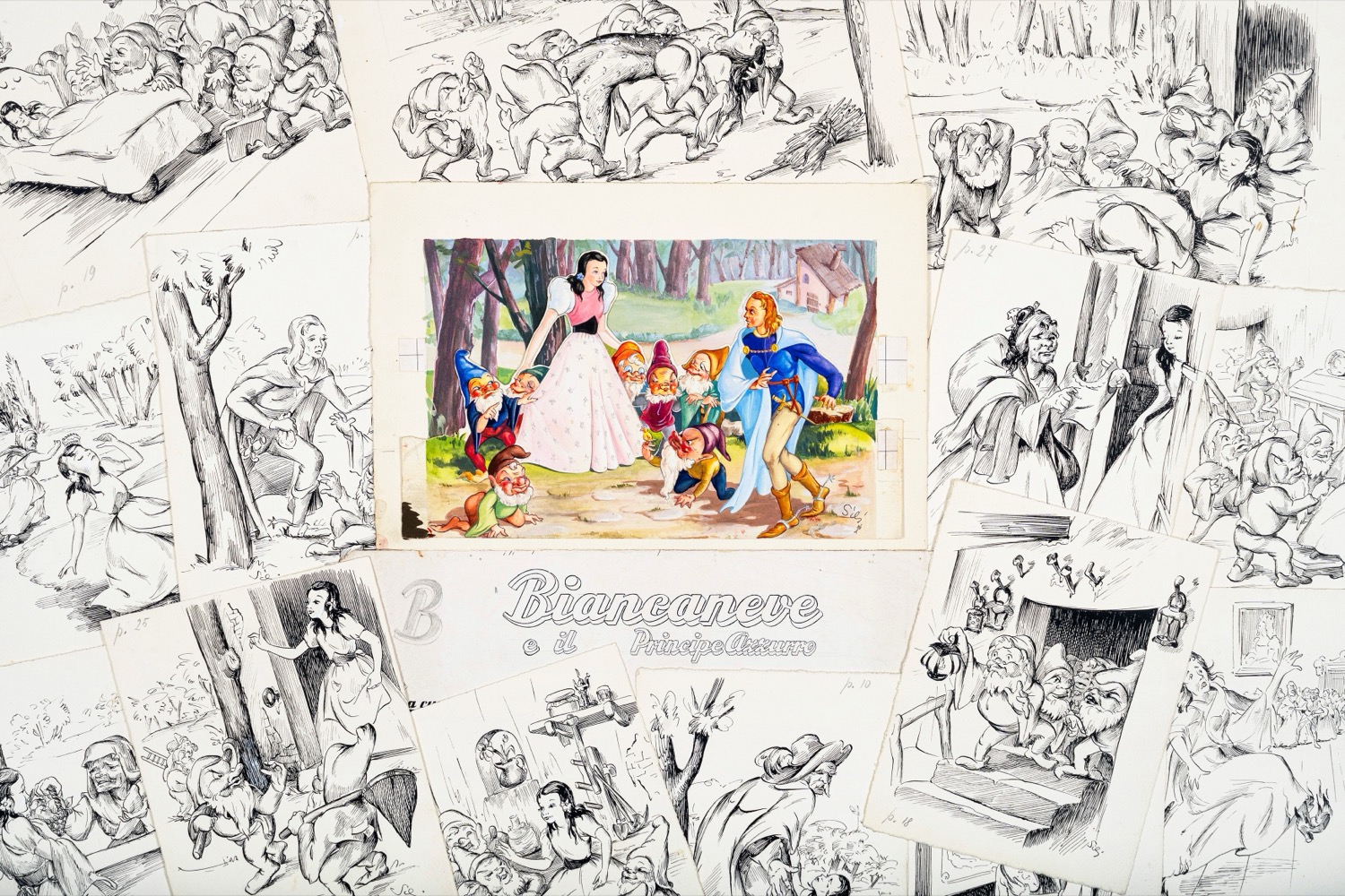 Lotto composto dall'originale di copertina e da 14 illustrazioni originali realizzate da Silipigni per il volume "Biancaneve e il Principe Azzurro", edito da Franceschini nel 1948. Si allega il titolo originale. Firmate.