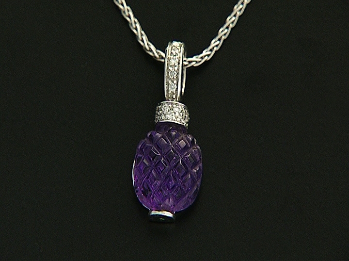 Lotto 214 | CIONDOLO CIONDOLO. In oro bianco 18 kt centrato da ametista incisa ad ananas...