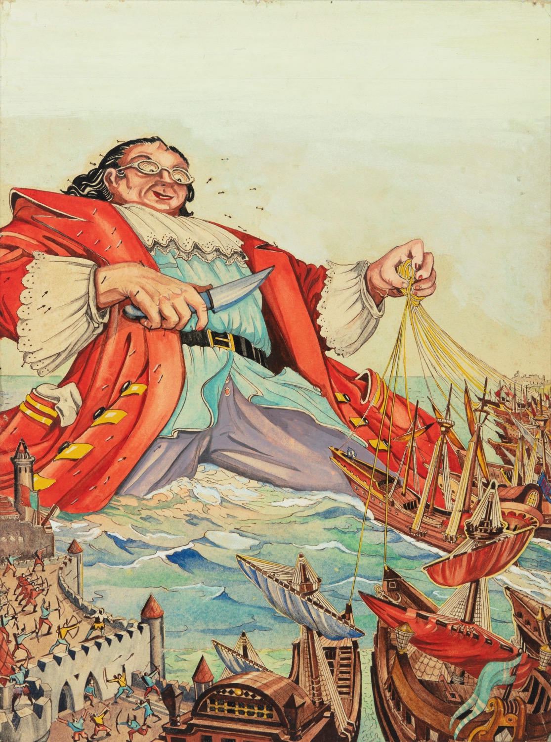 Illustrazione originale realizzata da Zampini per il romanzo "I viaggi di Gulliver" di Jonathan Swift, edito dall'editore Franceschini nel 1951. Lievi pieghe agli angoli.