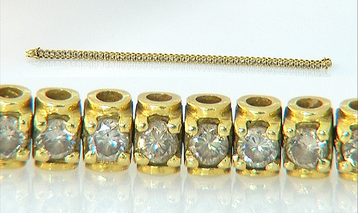 BRACCIALE TENNIS. In oro giallo 18 kt a maglie cilindriche interamente percorse da diamanti taglio brillante per tot. cts. 5,00 ca.