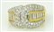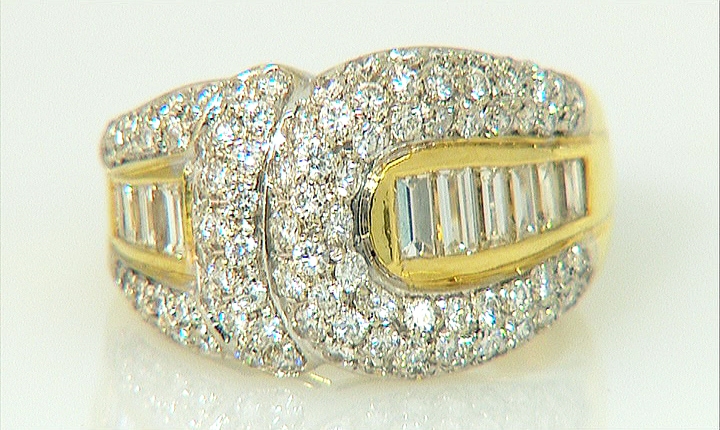 ANELLO. In oro giallo e bianco 18 kt montatura asimmetrica con decori in diamanti taglio baguette incastonati a binario e brillante su griffes per tot. cts. 2,00 ca.