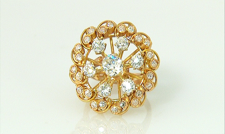 ANELLO. In oro rosè 18 kt liscio e satinato, montatura circolare con motivi in filo d'oro, al centro sette diamanti taglio vecchio per tot. cts. 2,00 ca. entro cornice in diamanti taglio vecchio per tot. cts. 1,00 ca.