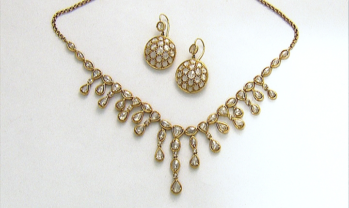 DEMI PARURE. In oro giallo 18 kt composta da coppia di orecchini a monachella di forma circolare e da collana con maglie ad anelli doppi e settore centrale frangiato, diamanti taglio rosa per tot. cts. 20,00 ca. a decoro.