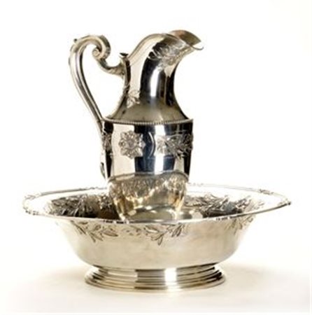 ACQUAMANILE Grande versatoio con catino in argento Decorato con motivi...