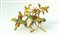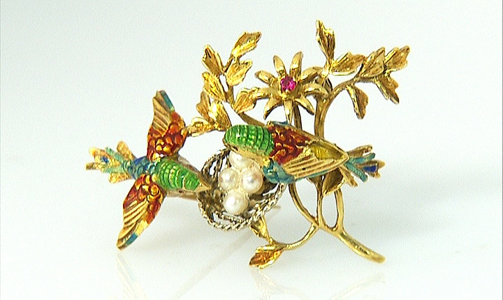 SPILLA ANNI '70 CA. In oro giallo e bianco 18 kt raffigurante ramage con uccellini, decori in smalto policromo, perle coltivate di mm 3 ca. e rubino taglio rotondo (prob. sintetico), chiusura ad ago semplice.