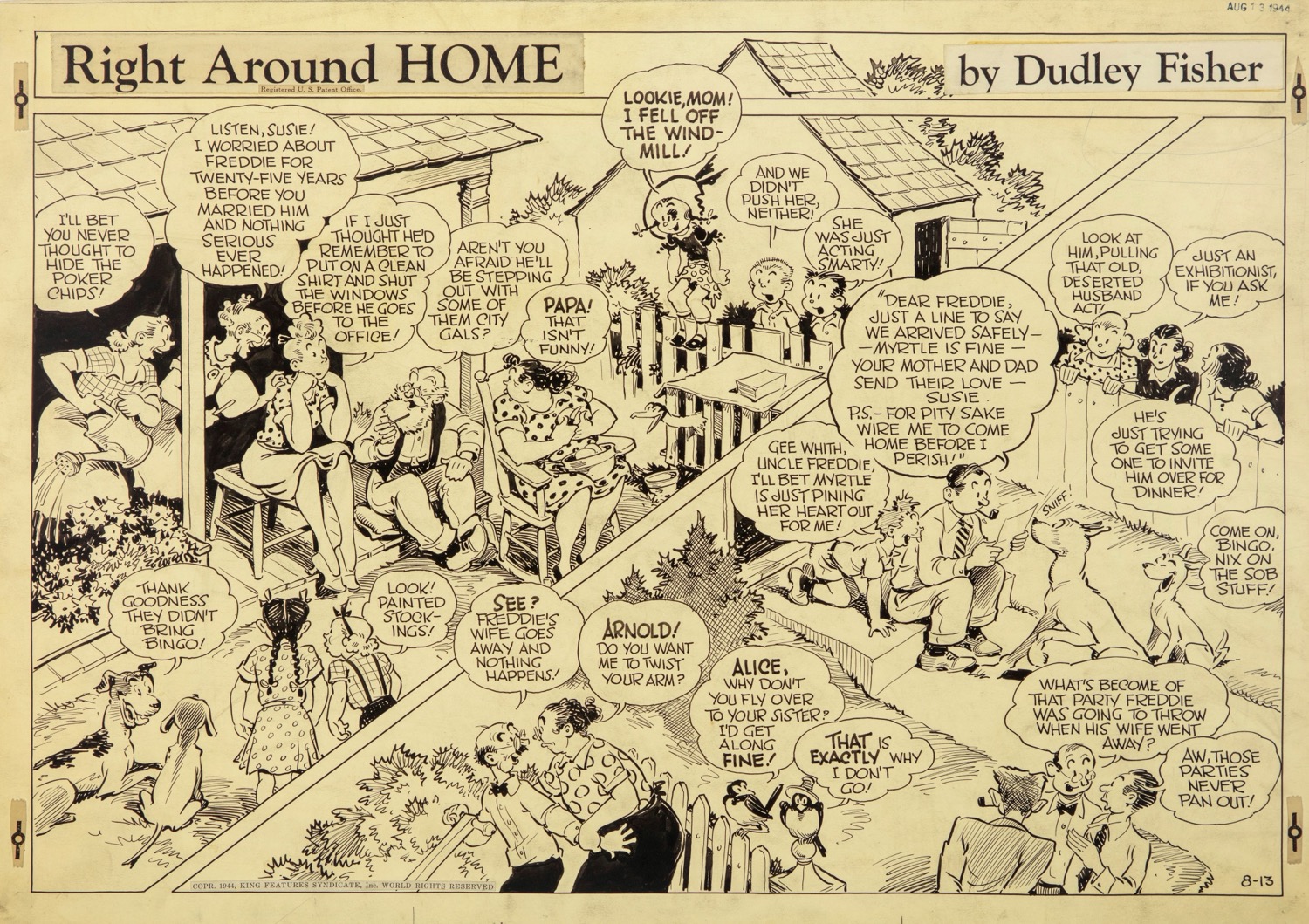 Tavola domenicale del 13/08/1944 per "Right Around Home". Creata nel 1938 dal genio di Fisher, "Right Around Home" è la strip americana per eccellenza, con ad un'ambientazione suburbana si concentra su una famiglia di quel quartiere, ma ciò che rese unica la sua striscia domenicale fu il formato; impiegava una visuale dall'alto verso il basso che mostrava numerosi personaggi in un'immensa vignetta singola che riempiva completamente un'intera pagina domenicale. Protagonista è la piccola ed energica Myrtle, divenne così celebre da guadagnarsi qualche anno dopo una striscia propria.