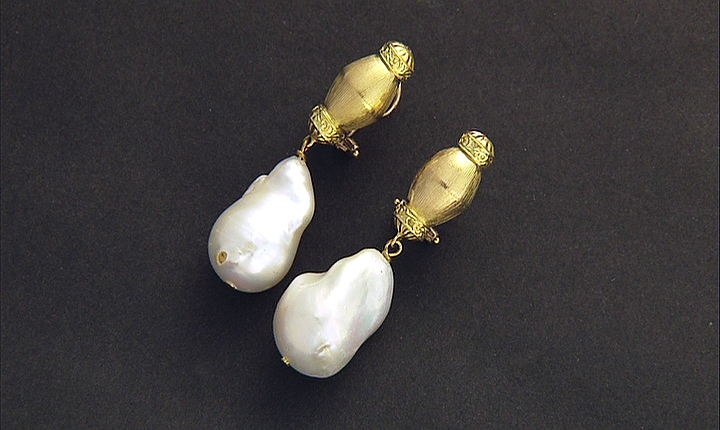 COPPIA DI ORECCHINI PENDENTI. In oro giallo 18 kt perno e clip settori superiori incisi realizzati a barilotto, perle coltivate barocche imperniate nella parte inferiore.