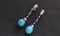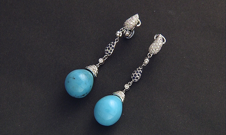 COPPIA DI ORECCHINI PENDENTI. In oro bianco 18 kt perno e clip, settori verticali decorati da diamanti taglio brillante per tot. cts. 1,00, zaffiri taglio rotondo per tot. cts. 0,70 ca. ed inserti in turchese naturale a goccia trattenuti da motivi a coppiglia.