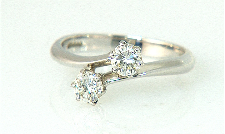 ANELLO. In oro bianco 18 kt a contrariè con due diamanti taglio brillante per tot. cts. 0,60 ca.