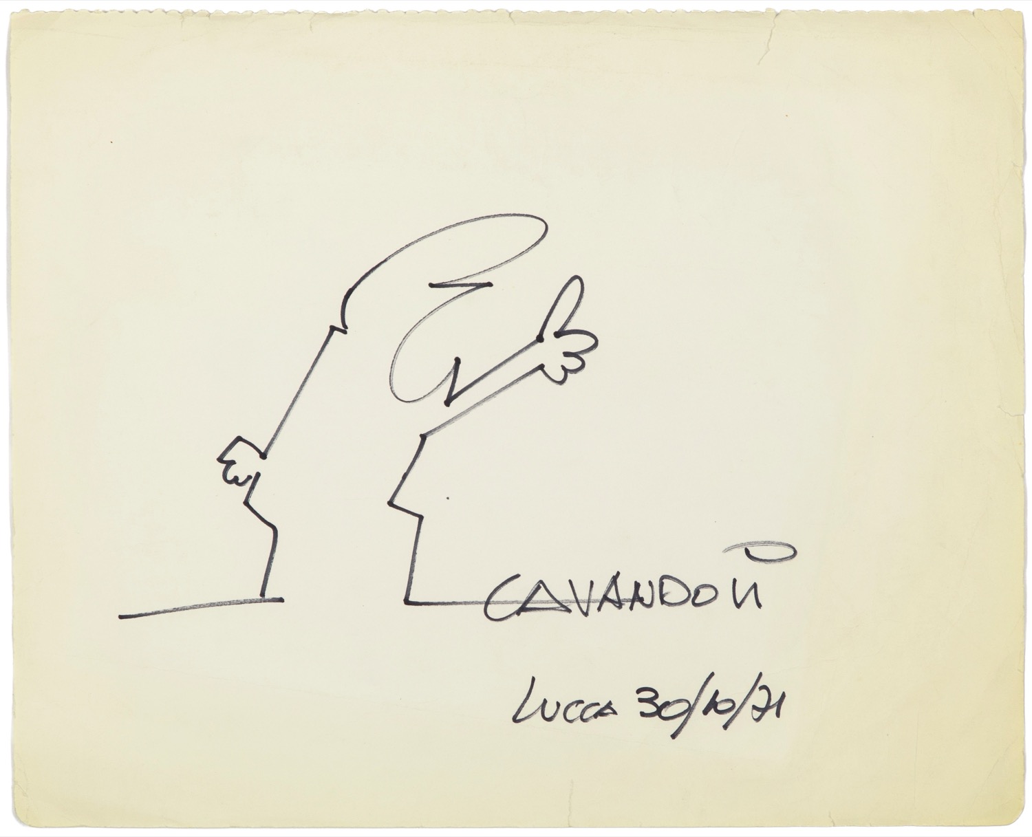 Disegno originale realizzato da Cavandoli in occasione dell'edizione di Lucca Comics del 1971. Pieghe e piccoli strappi ai margini. Firmato e datato.