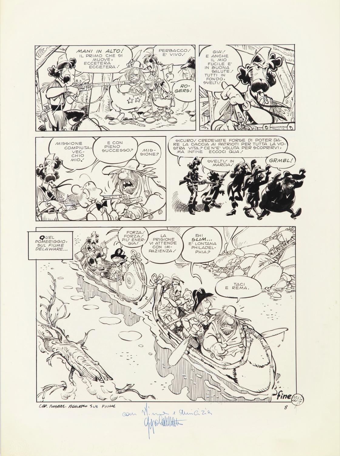 Tavola originale realizzata da Cavazzano per "Agguato sul fiume", pag. 8 della settima avventura di Capitan Rogers edita per la prima volta sulle pagine de Il Giornalino n. 19 nel 1984. Testi di Francois Corteggiani. Di grande rarità. Firmata e dedicata.
