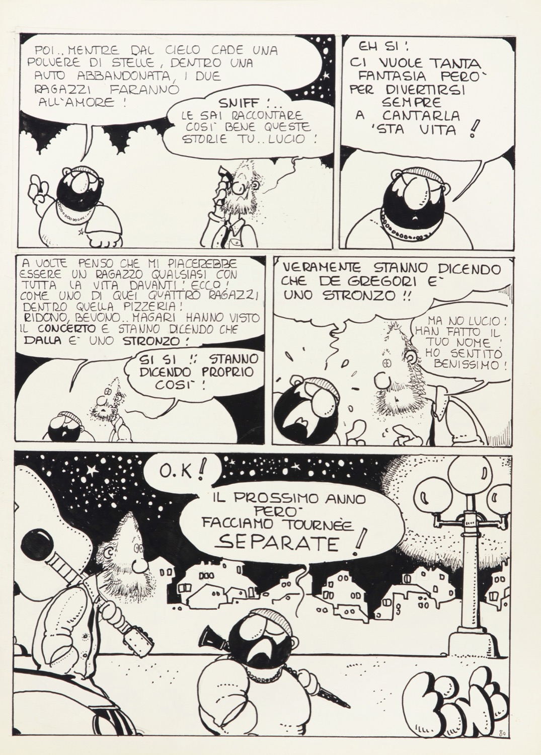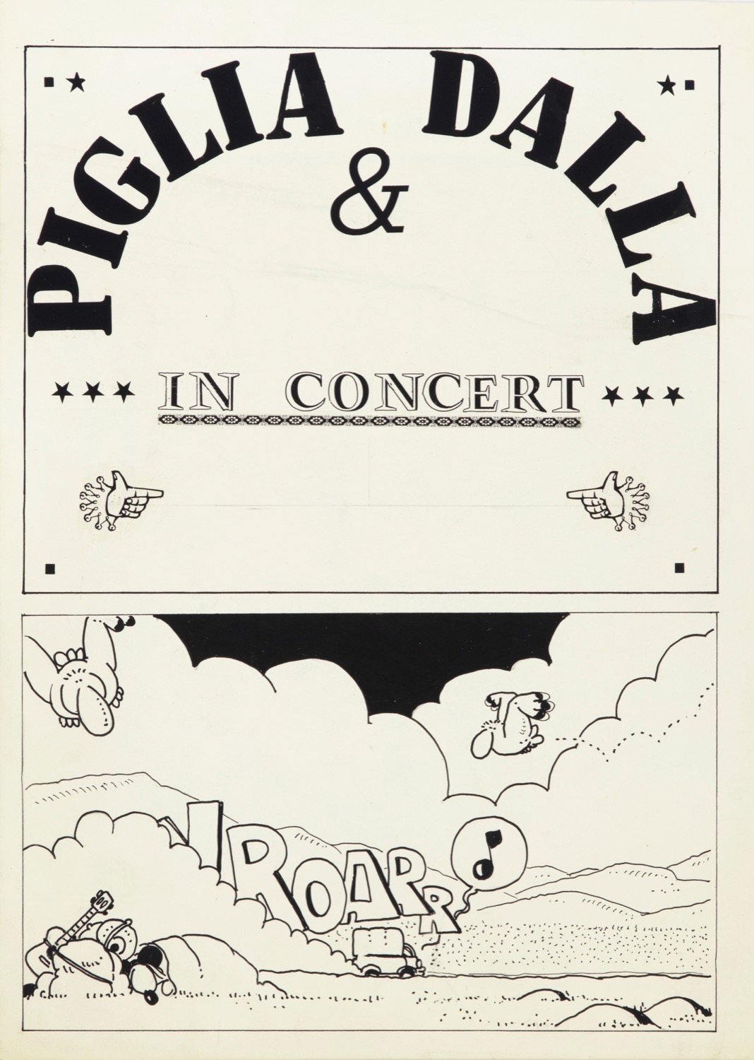 Lotto composto da 2 tavole originali, la title page e la pagina conclusiva, realizzate da Cavezzali per il volume "Piglia e Dalla in concerto", edito da L'Isola Trovata nel 1981. Storia fumettata della mitica tourneè di Dalla e De Gregori.