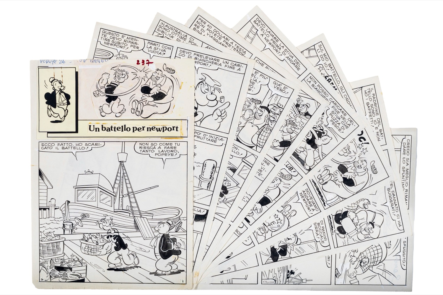 Storia completa composta da 8 tavole originali realizzate da Dossi per "Un battello per Newport", avventura pubblicata su Braccio di Ferro n. 26 dalla Bianconi negli anni '70. Lievi pieghe e piccoli strappi ai margini. Firmata in ogni pagina al retro.