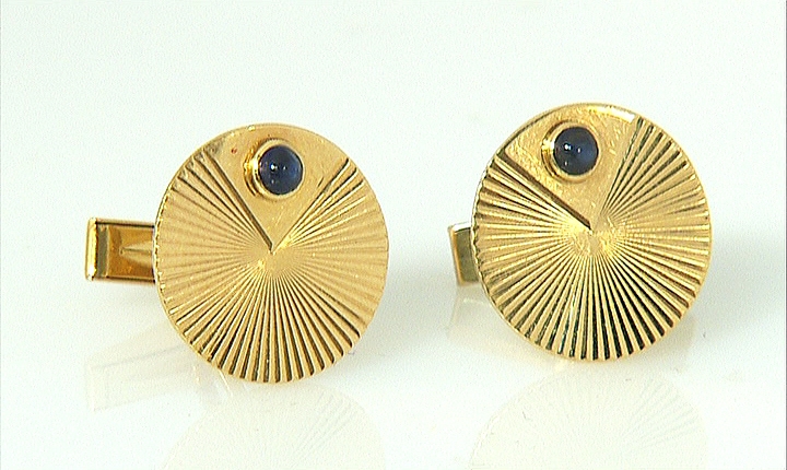 COPPIA DI POLSINI DI TIFFANY & CO. In oro giallo 14 kt di forma circolare con motivi a raggiera, zaffiri taglio rotondo cabochon di cts. 0,40 ca. a decoro.