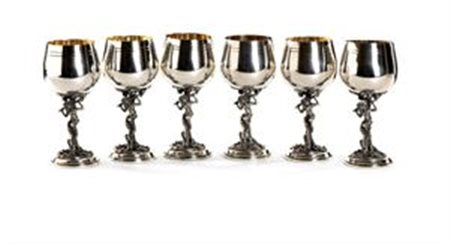 SERVIZIO DI CALICI Dodici calici in argento interno dorato . La base é composta da figura femminile Peso gr. 3.000 Twelve glasses in silver gilt interior. The base is made ??up of female figure Weight gr. 3,000