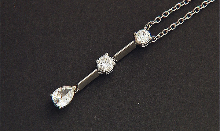 CIONDOLO. In platino, montatura a settori verticali trattenenti due diamanti taglio brillante per tot. cts. 0,60 ca. e diamante taglio goccia di cts. 0,65 ca. (prob colore H purezza SI), trattenuto da catenina fissa ad anelli in platino.