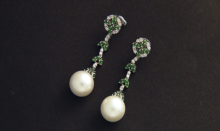COPPIA DI ORECCHINI PENDENTI. In oro bianco 18 kt perno e farfalla con settori floreali verticali decorati da diamanti taglio brillante per tot. cts. 1,00 ca., tsavoriti taglio rotondo per tot. cts. 0,90 ca. e perle coltivate South Sea di mm 14 ca. imperniate nella parte terminale.