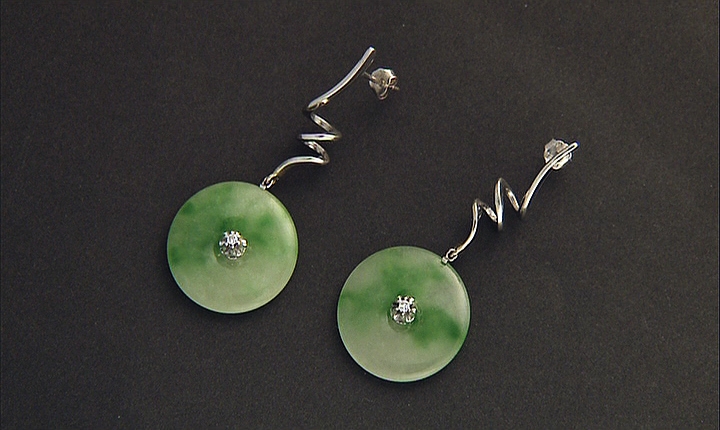 COPPIA DI ORECCHINI PENDENTI. In oro bianco 18 kt perno e farfalla con motivi a spirale e dischi in giada decorati al centro da due diamanti taglio brillante per tot. cts. 0,06 ca.