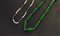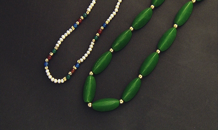 LOTTO DI DUE COLLANE. Una ad un filo di piccole perle coltivate di mm 5 ca. alternate a settori in sfere multicolor ed una ad un filo in giade entrambe con interruttori e chiusura in oro giallo 18 kt.