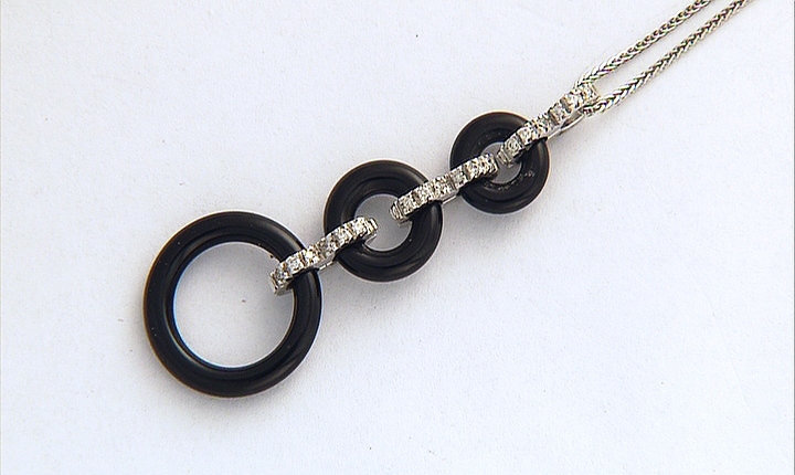 CIONDOLO. In oro bianco 18 kt con inserti incernierati ad anelli in onice e decoro verticale in diamanti taglio brillante per tot. cts. 0,20 ca. trattenuto da catenina in oro bianco 18 kt.