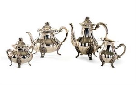 SERVIZIO IN ARGENTO Servizio in argento Composto da : Teiera, caffettiera, lattiera, zuccheriera. Di gusto Barocco. Cesa Alessandria Peso gr. 1775 Silver service Composed by: Teapot, coffee pot, milk jug, sugar bowl. Baroque taste. Cesa Alexandria Weight gr. 1775