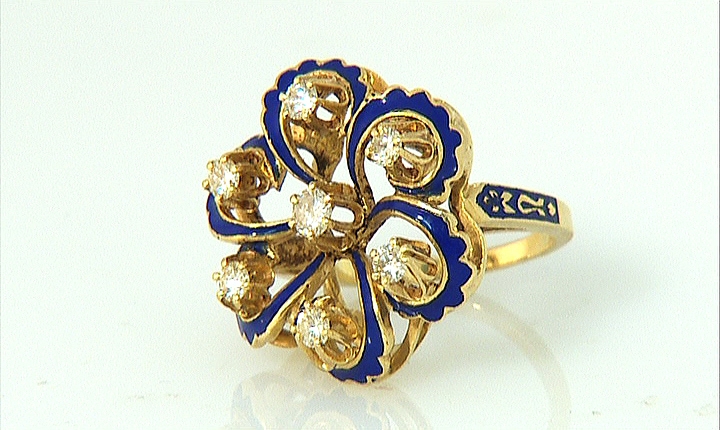 ANELLO. In oro giallo 14 kt sommità a fiore stilizzato con decori in smalto blu e diamanti taglio brillante per tot. cts. 0,70 ca.
