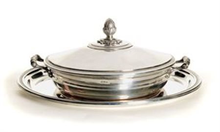 ZUPPIERA Zuppiera con coperchio e piatto in argento di gusto neoclassico....