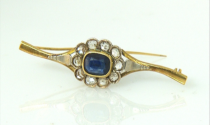 SPILLA INIZIO XX SECOLO. In oro 18 kt ed argento realizzata a fiore con al centro zaffiro taglio ovale di cts. 2,80 ca. entro contorno in diamanti taglio rosa.