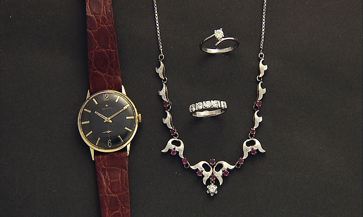 LOTTO DI TRE GIOIELLI ED UN OROLOGIO. In oro bianco e giallo 18 kt composto da due anelli, una collana ed uno Zenith carica manuale, diamanti taglio brillante per tot. cts. 1,20 ca. e rubini taglio rotondo per tot. cts. 1,20 ca.