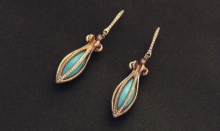 COPPIA DI ORECCHINI PENDENTI. In oro rosa 18 kt a monachella aperta con settori sagomati in pasta di turchese entro motivi a gabbietta, diamanti taglio brillante per tot. cts. 0,50 ca.