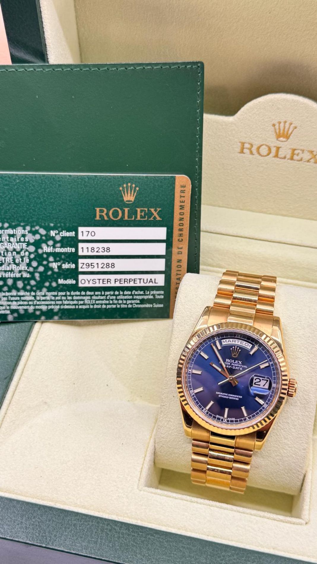 Marca Rolex Modello (Orologio) Day-Date 36 Numero di referenza 118238 Carica Automatico Materiale della cassa Oro giallo Materiale cinturino Oro giallo Anno di produzione 2007 Condizione Ottimo (di seconda mano, segni di usura assenti o appena visibili) Corredo documenti originali, no box Carica Automatico Materiale della cassa Oro giallo Diametro 36 mm Impermeabile 10 ATM Materiale lunetta Oro giallo Vetro Vetro zaffiro Numeri sul quadrante Senza numeri Cinturino Materiale cinturino Oro giallo Colore cinturino Oro Materiale chiusura Oro giallo - COMMISSIONE D’ASTA 25%