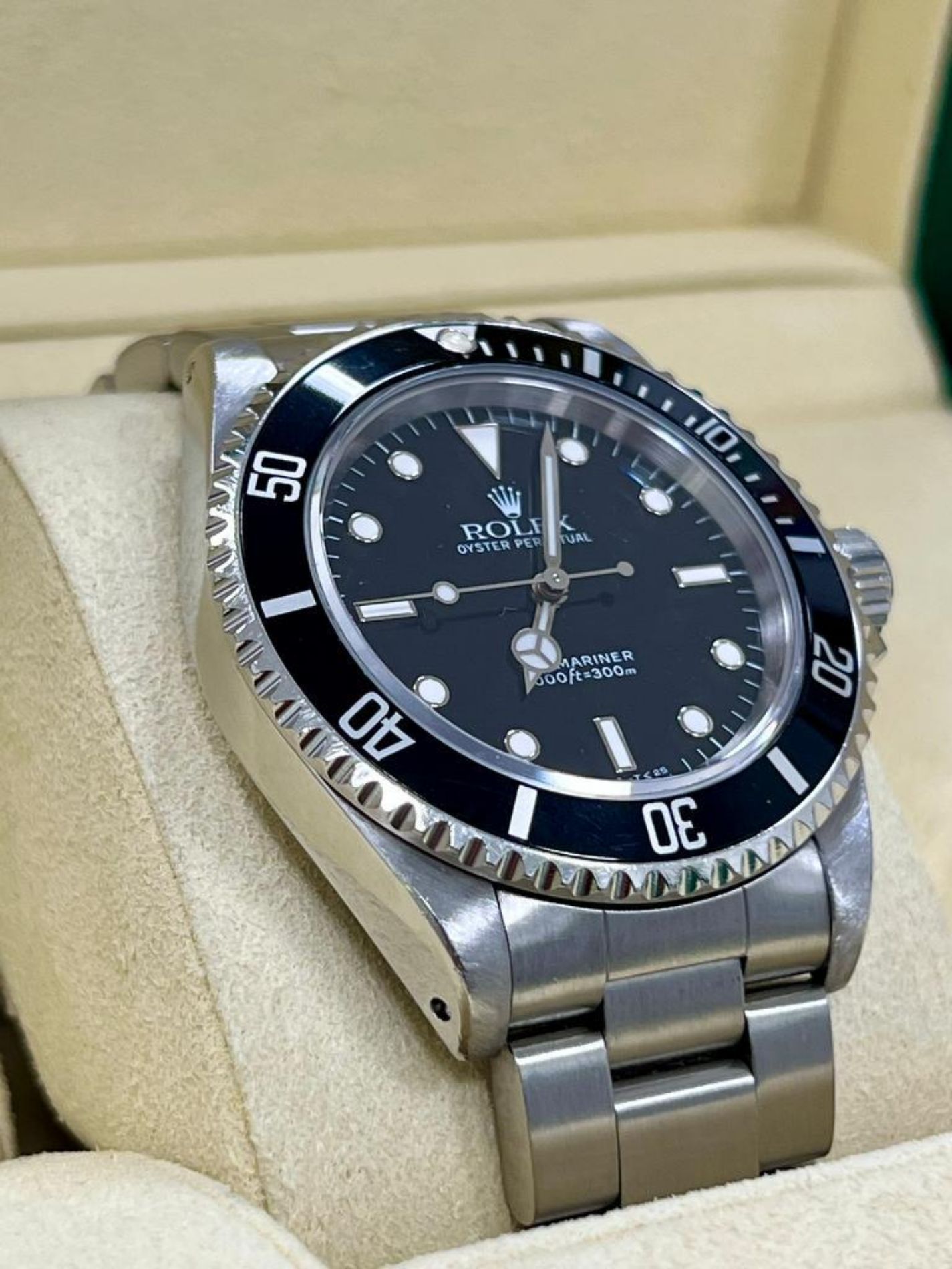 Marca Rolex Modello (Orologio) Submariner (No Date) Numero di referenza 14060 Carica Automatico Materiale della cassa Acciaio Materiale cinturino Acciaio Anni 90 Condizione Ottimo (di seconda mano, segni di usura assenti o appena visibili) Corredo Con documenti originali, no box, la scatola viene utilizzata solo per fotografie non è in vendita Materiale della cassa Acciaio Diametro 40 mm Impermeabile 30 ATM Materiale lunetta Acciaio Vetro Vetro zaffiro Quadrante Nero Numeri sul quadrante Senza numeri Cinturino Materiale cinturino Acciaio Colore cinturino Acciaio Chiusura Déployante Materiale chiusura Acciaio - COMMISSIONE D’ASTA 25%