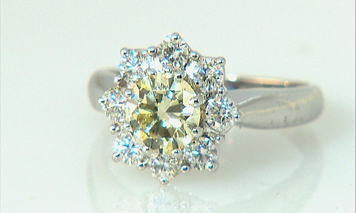 ANELLO. In oro bianco 18 kt centrato da diamante light yellow fancy taglio brillante di cts. 1,00 ca. (prob. purezza VVS) entro cornice in diamanti taglio brillante per tot. cts. 0,70 ca.