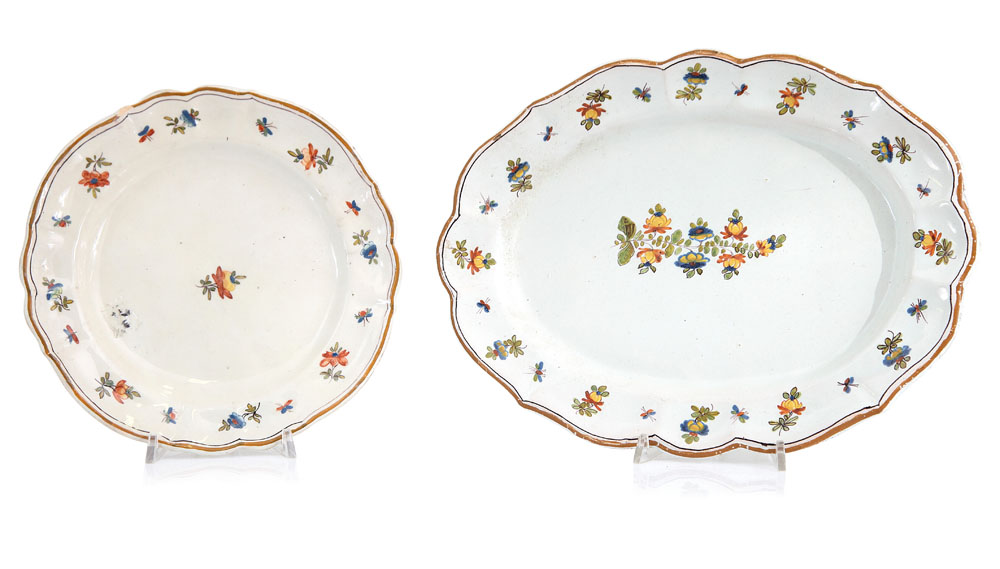 DUE PIATTI IN MAIOLICA, MILANO, XVIII SECOLO, uno ovale e uno circolare con decoro a fiori sparsi e profili ocra.