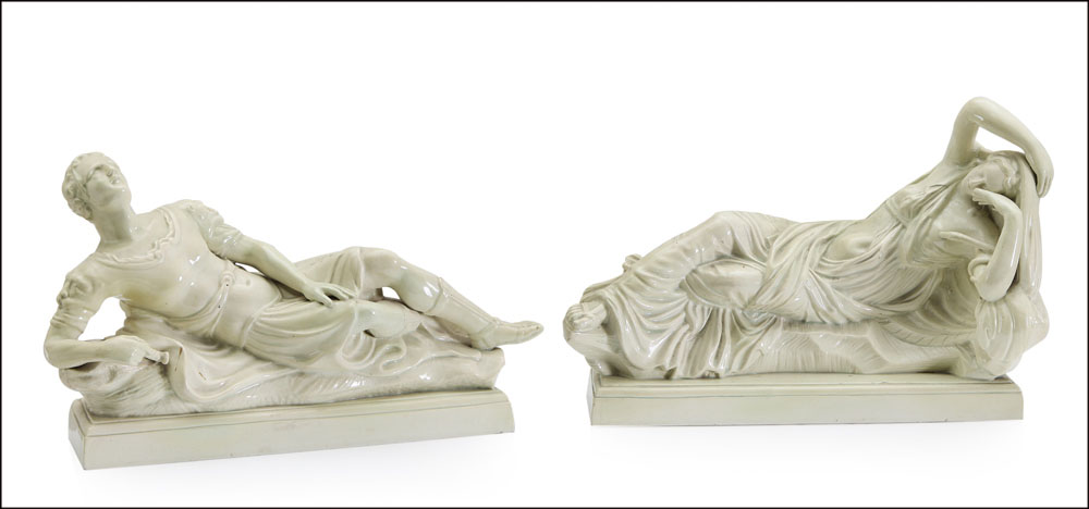 COPPIA DI FIGURE IN MAIOLICA, FINE XVIII SECOLO, raffiguranti Cleopatra e Antonio distesi su base gradinata.