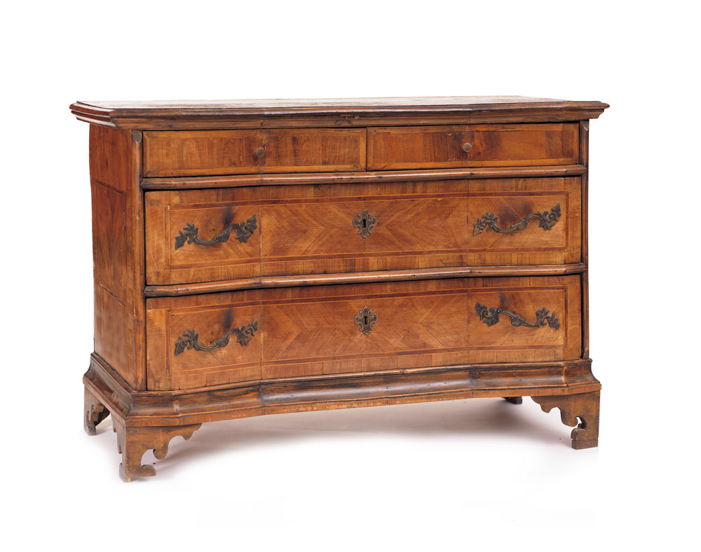 PICCOLO CASSETTONE IN STILE ANTICO, XX SECOLO, realizzato con elementi antichi, a tre cassetti con fronte convesso; usure e sbeccature.