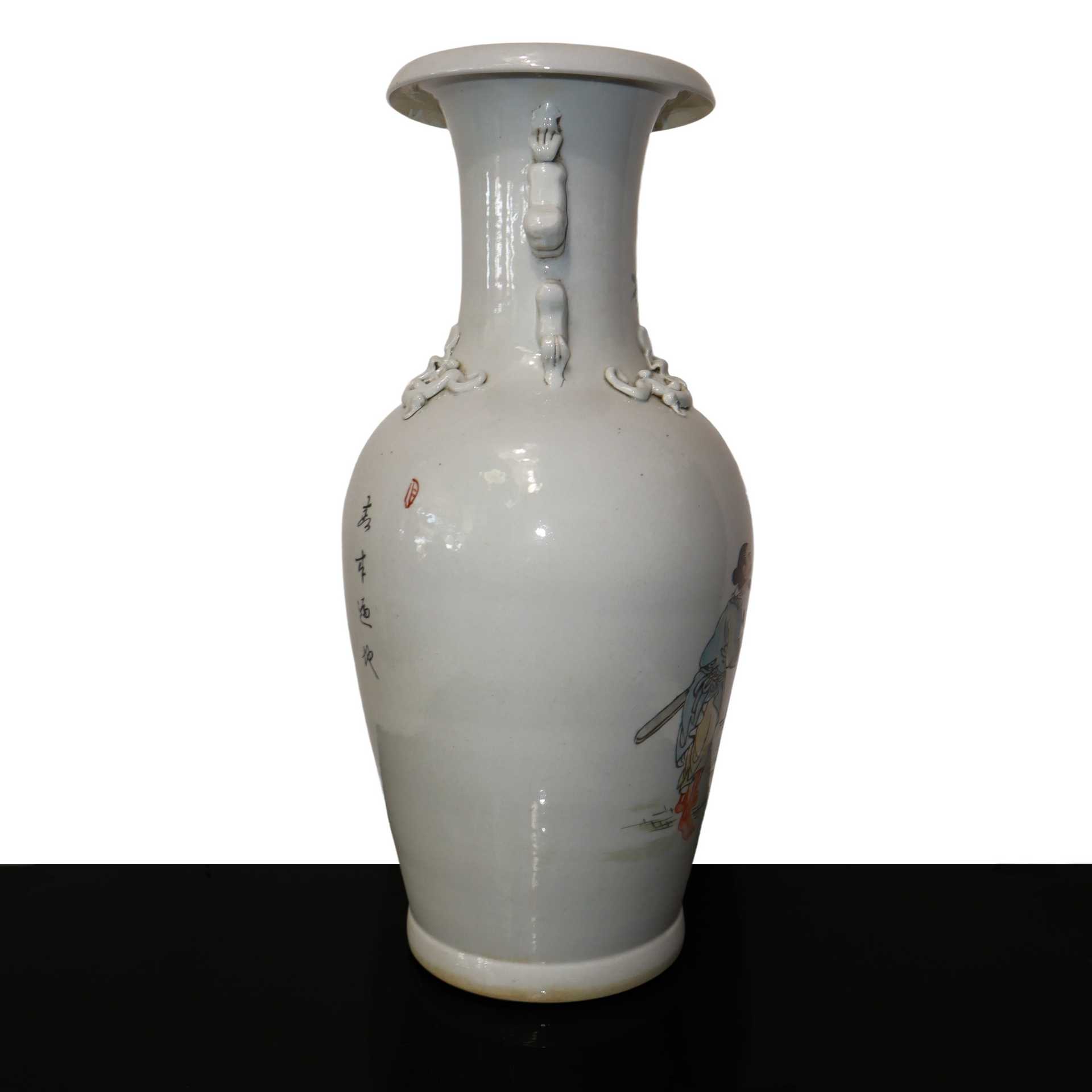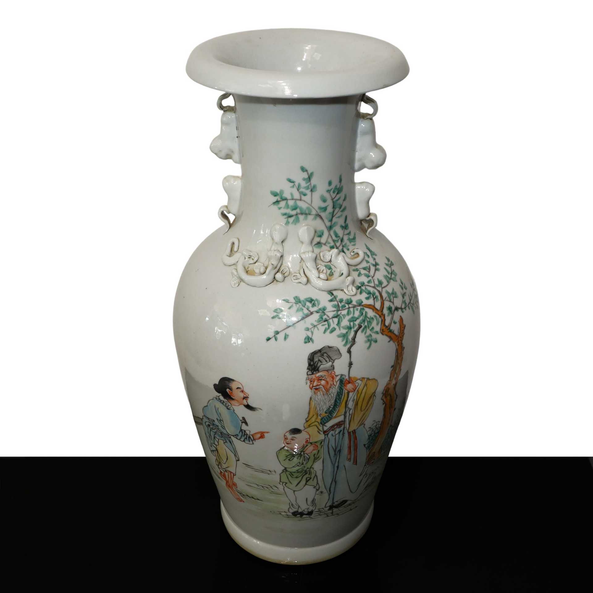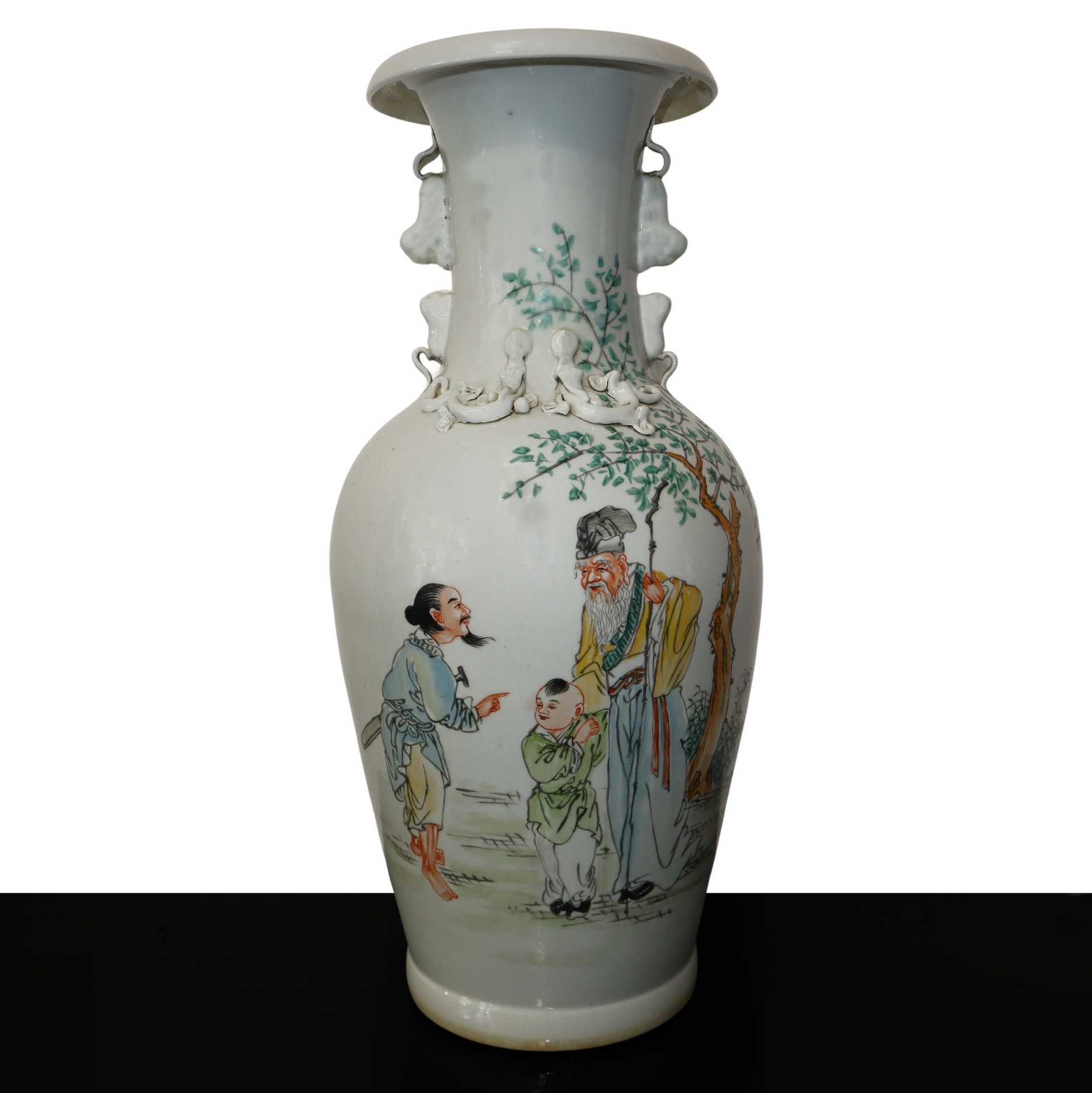 Vaso cinese Qian Jiang con decorazione a rilievo sul collo e raffigurazione di scene di vita sul fronte, 19°/20° secolo , h cm 45
