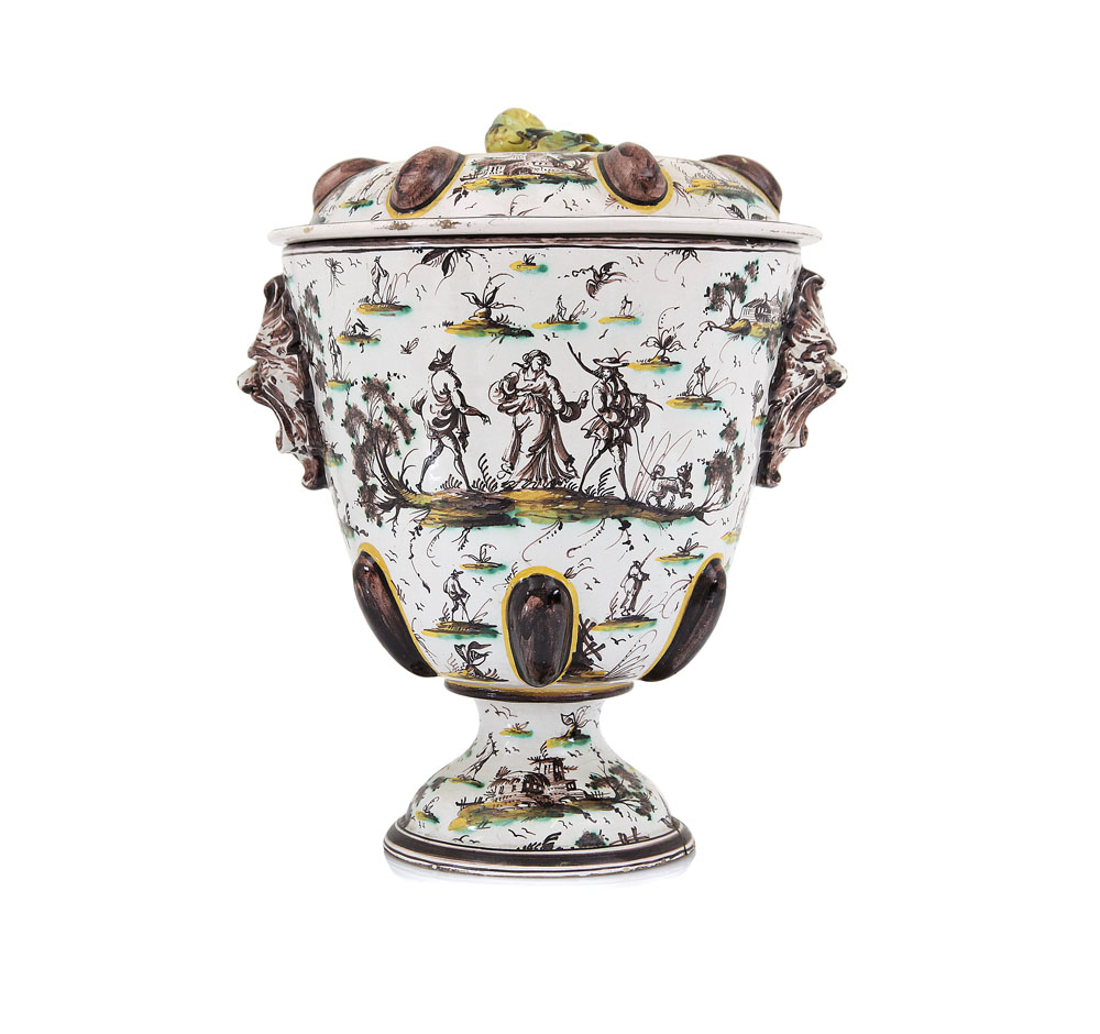 CISTA CON COPERCHIO IN CERAMICA, SAVONA, XIX SECOLO, decoro in stile settecentesco a figurette entro paesaggio; rincollature alla base e sbeccature.