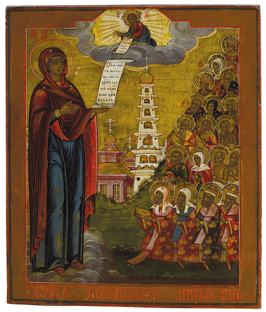 ICONA RUSSA DEL XIX SECOLO Madonna con schiera di SantiTempera all'uovo su...