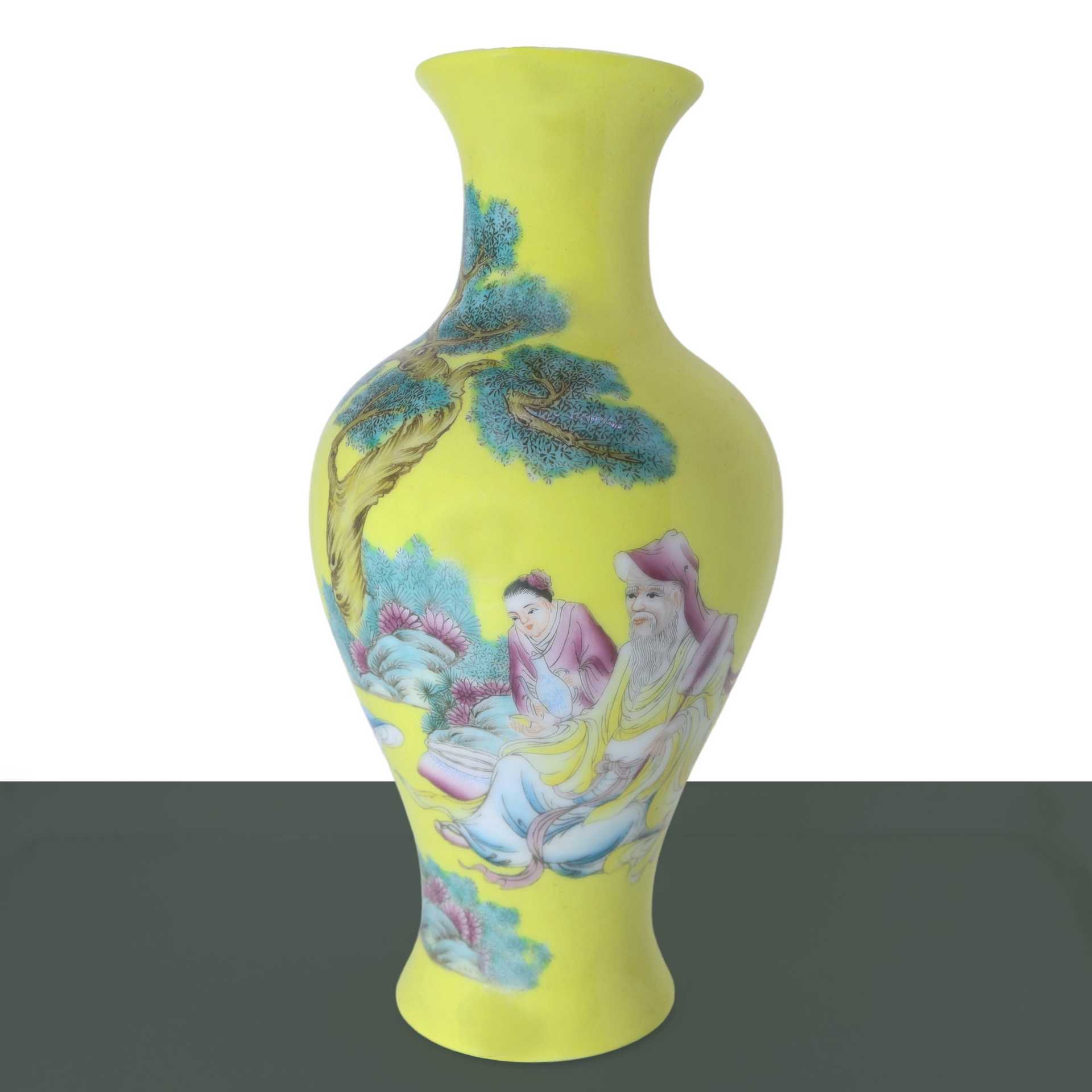 Bottiglia nei toni del giallo con raffigurazioni policrome di personaggi, 19° secolo , h cm 24 x diametro cm 12 Marchio Qianlong al fondo