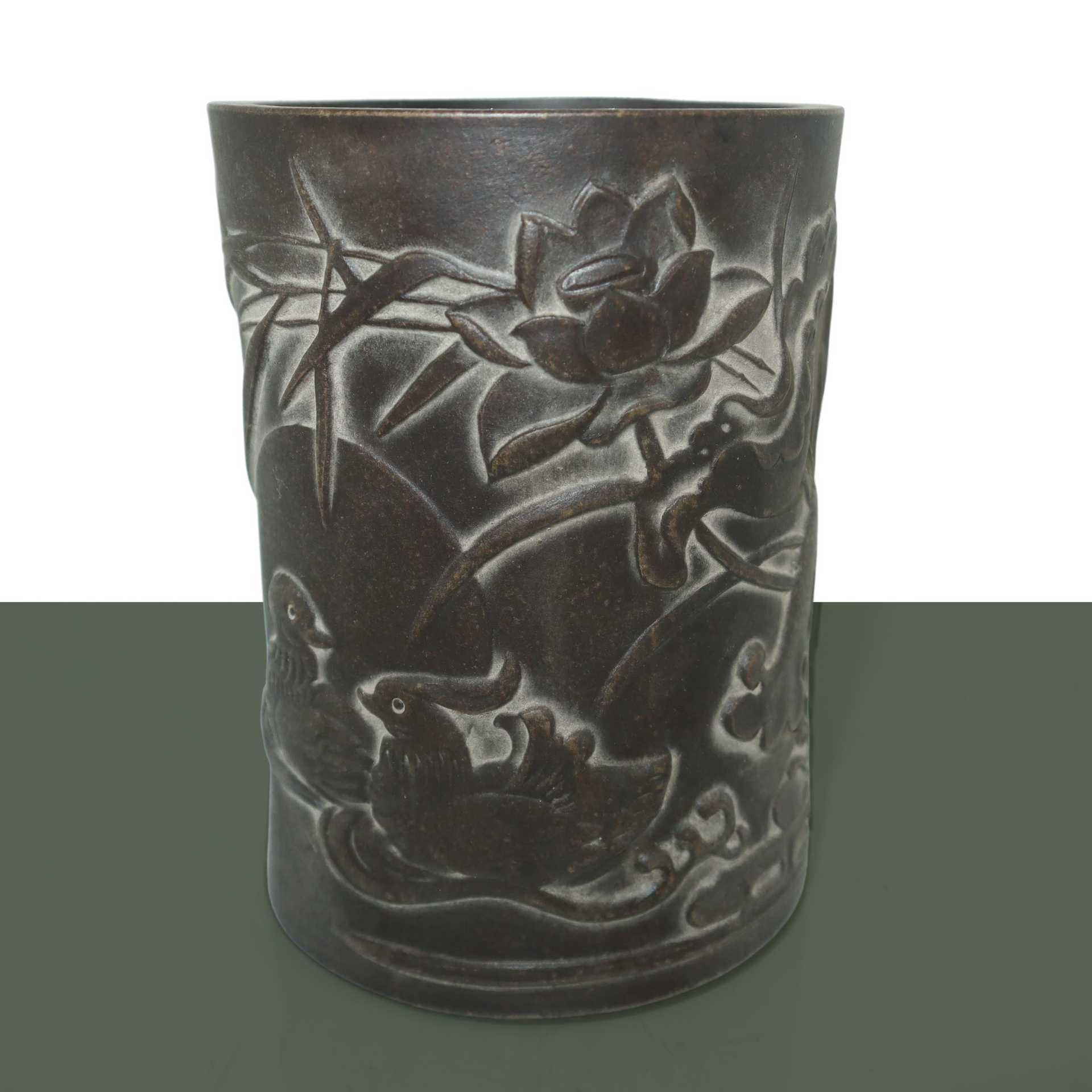 Portapenne e tazza per il thè in argilla viola Yixing, Qing dinastia, 19°/20° secolo.