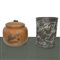 Portapenne e tazza per il thè in argilla viola Yixing, Qing dinastia, 19°/20° secolo. porta penne , h cm 15,5 e diametro 8 cm, tazza cm 11 diametro 12