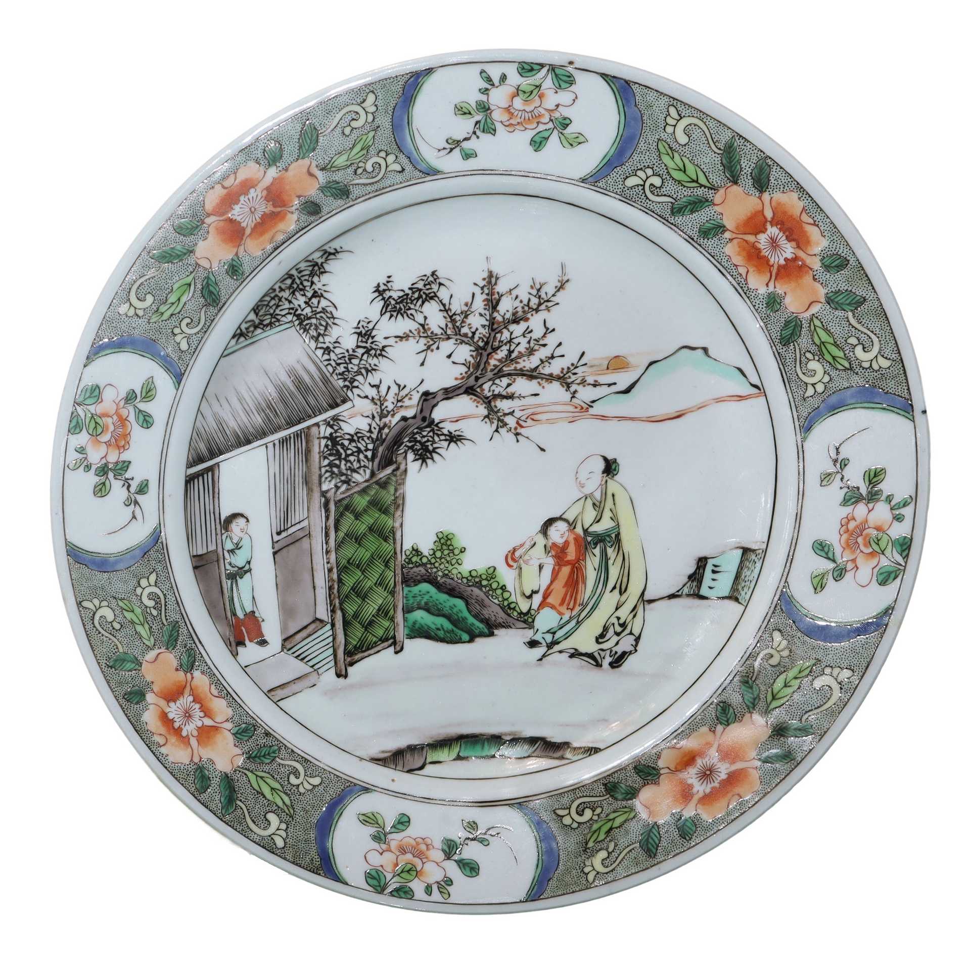 Piatto in ceramica cinese dinastia Qing Periodoo Kangxi con raffigurazione di un maestro con allievo, 17° secolo