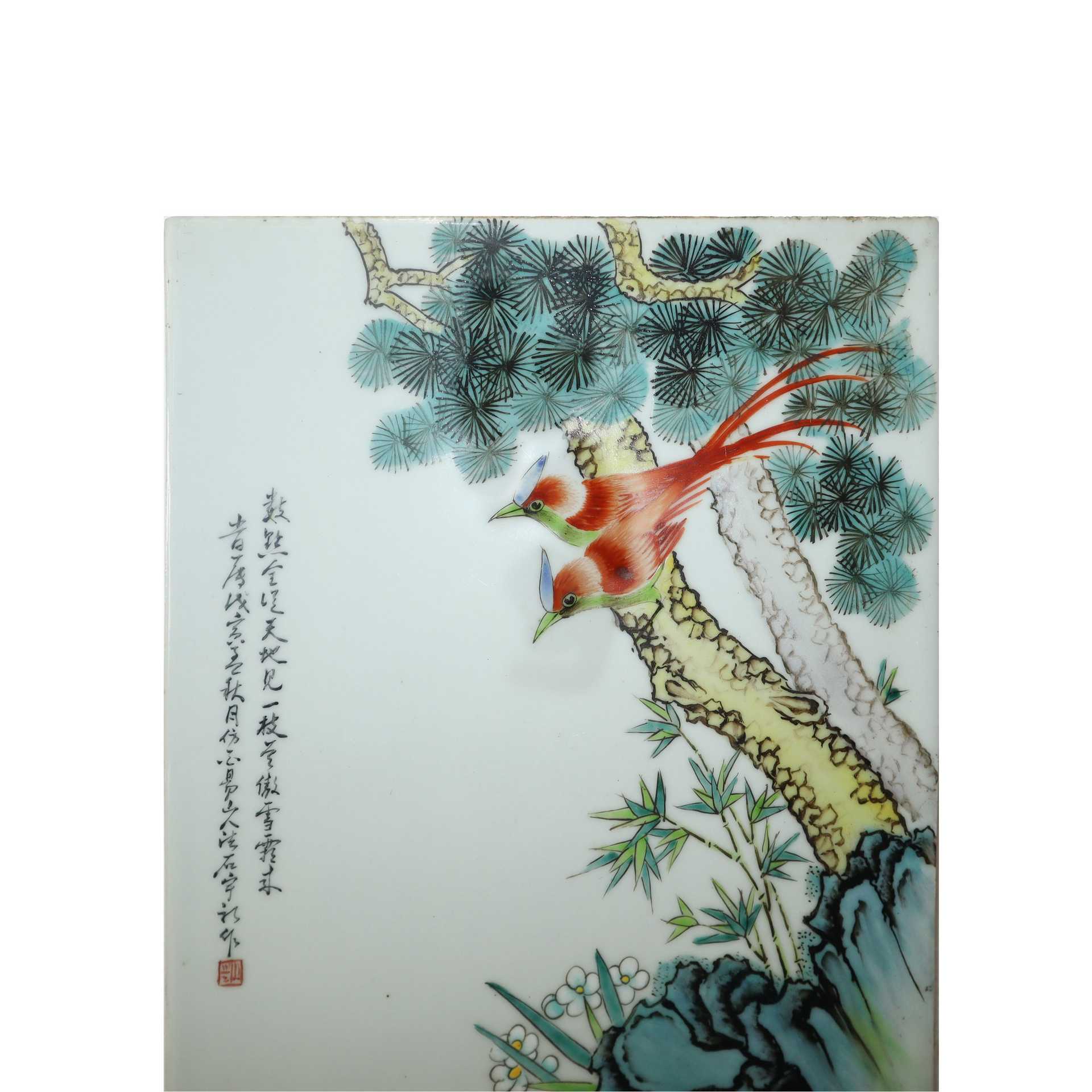 Mattonella cinese in ceramica con raffigurazione di albero con uccelli e iscrizioni, 20° secolo