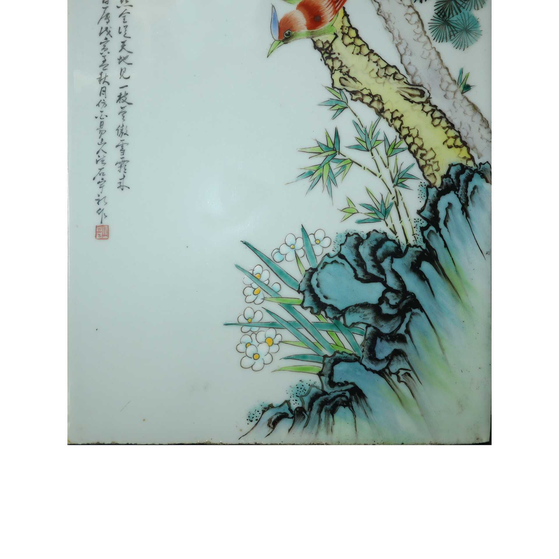 Mattonella cinese in ceramica con raffigurazione di albero con uccelli e iscrizioni, 20° secolo , h cm 25X36,5