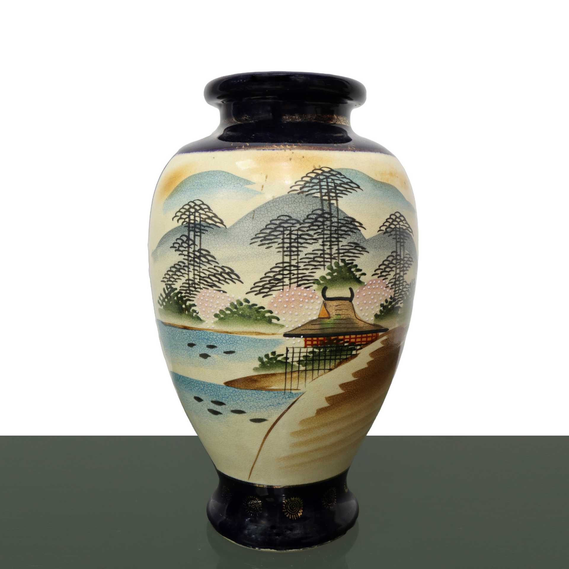 Vaso giapponese dipinto a mano con geisha in barca , h cm 26x15 Vaso giapponese in ceramica con sfondo blu scuro, immagini di gheisha in barca e paesaggi e decorazioni dorate floreali.