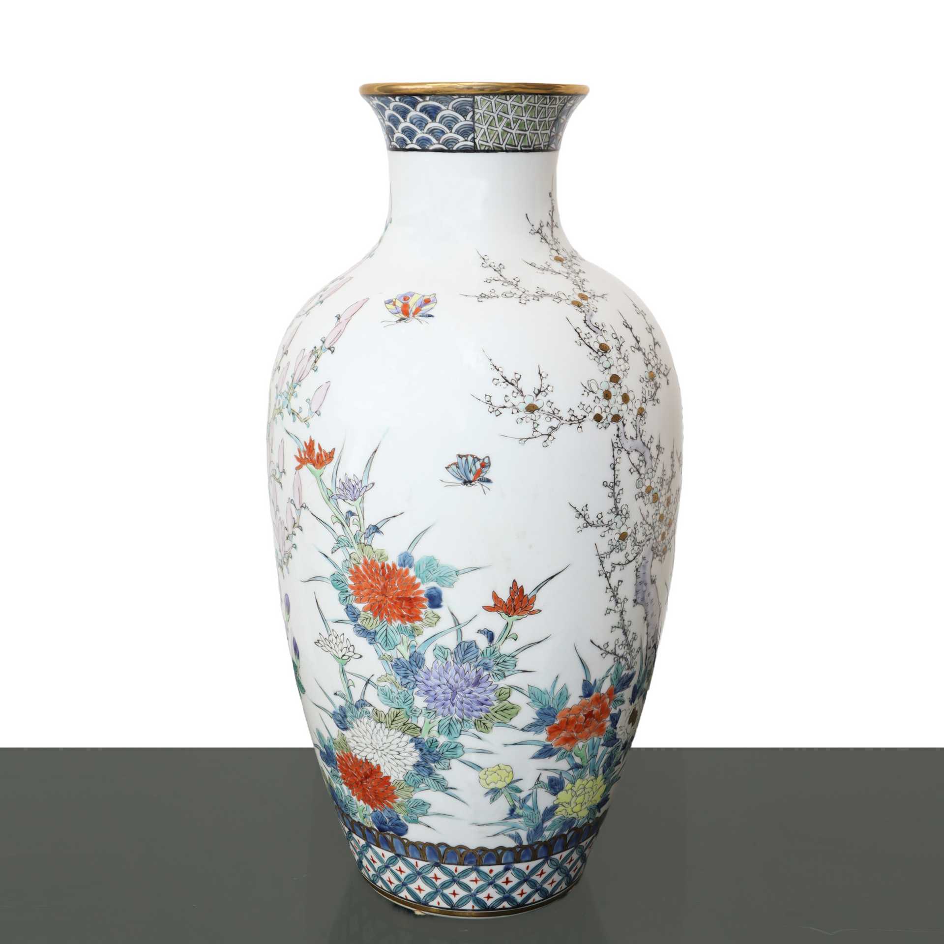 Vaso cinese in porcellana, con decori floreali e bordo dorato , h cm 39x18 Marchio alla base.